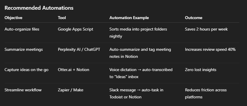 Automation example: Google Drive file organization scripts (reduces media sorting).