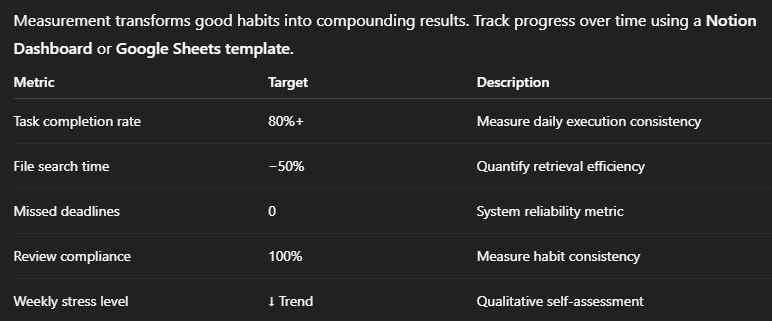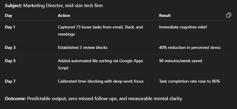 Outcome: Predictable output, zero missed follow-ups, and measurable mental clarity.